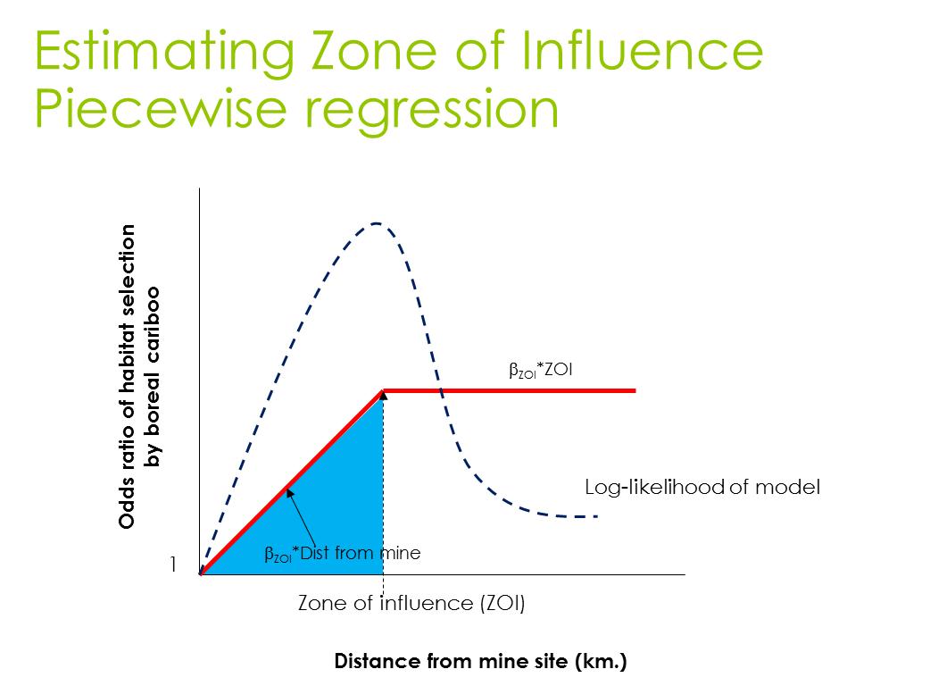 Estimation of the zone of influence of mines on caribou distribution Government of Northwest Territories, Yellowknife, NWT. Habitat (RSF) models based upon aerial survey and satellite collar data were used to estimate displacement of caribou from mine areas during the summer season